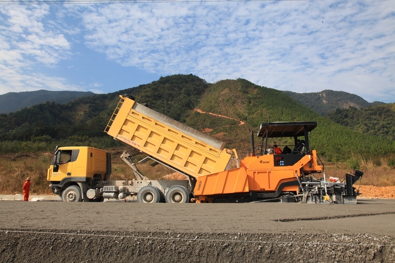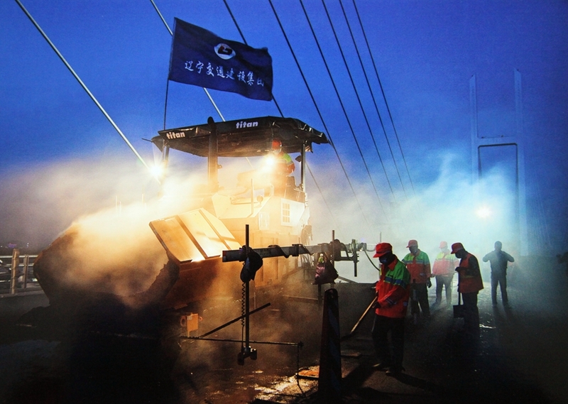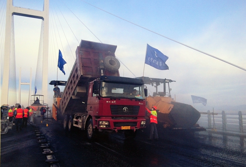 陜建機股份瀝青攤鋪機雙機并鋪助力中朝鴨綠江界河公路大橋建設(shè)2014年6月